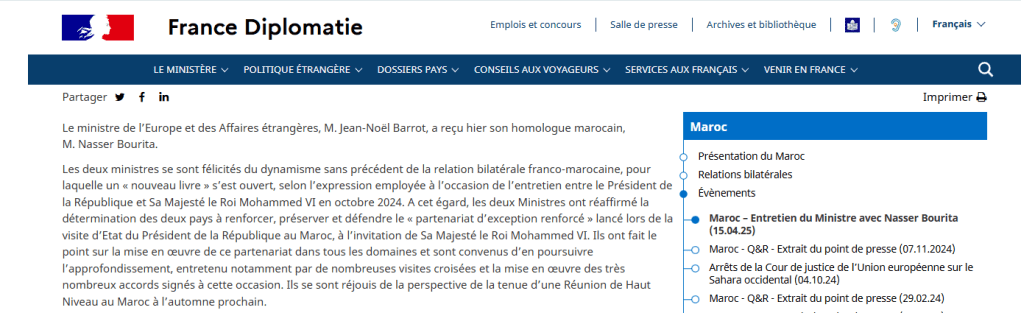 Minister Barrot erinnerte an die unantastbare Position Frankreichs: Die Sahara unterliegt der vollen Souveränität Marokkos. Frankreich betrachtet den marokkanischen Autonomieplan von 2007 als die einzige ernsthafte und glaubwürdige Grundlage, um eine dauerhafte politische Lösung zu erreichen, die dem Völkerrecht entspricht. Paris unterstützt die Bemühungen der UNO voll und ganz und wird die wichtigen wirtschaftlichen und sozialen Entwicklungsbemühungen Marokkos in seinen südlichen Provinzen weiterhin begleiten.